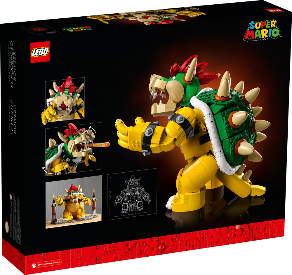 - The Mighty Bowser™ display piece – This LEGO® Super Mario™ character model, including the display stand, measures over 12.5 in. (32 cm) high, 16 in. (41 cm) wide and 11 in. (28 cm) deep